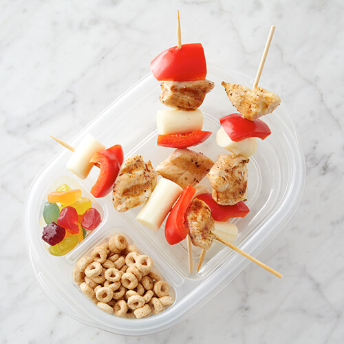 Skewer grilled chicken, cheese cubes, and veggies for a fun lunch-on-a-stick. Or skip the skewers and toss ingredients into a DIY salad with dressing on the side.